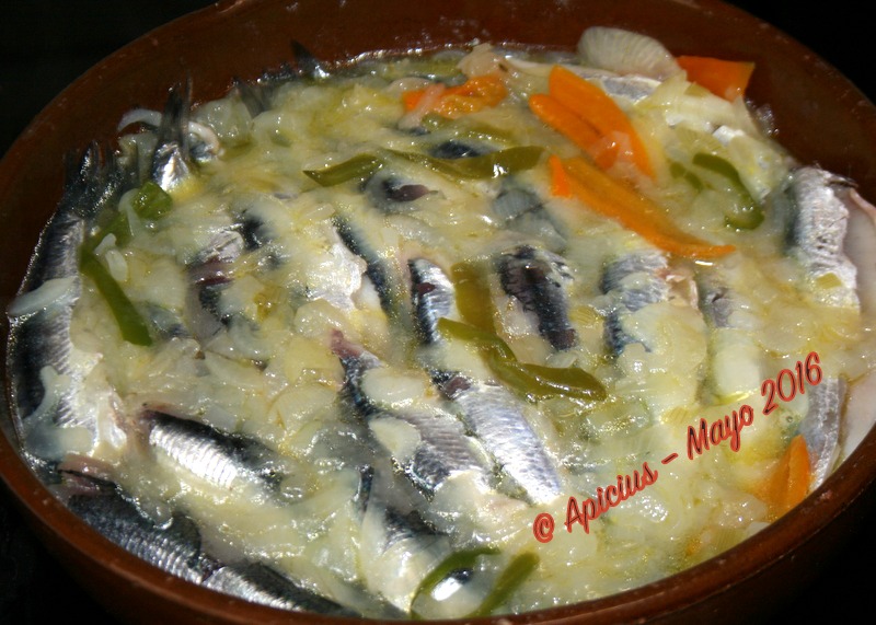de la cebolla, ponemos todo al fuego suave y cuando comienza a hervir, tapamos, apagamos la placa y en 6 minutos tendrán unas antxoas, bocartes o boquerones bien sabrosos.